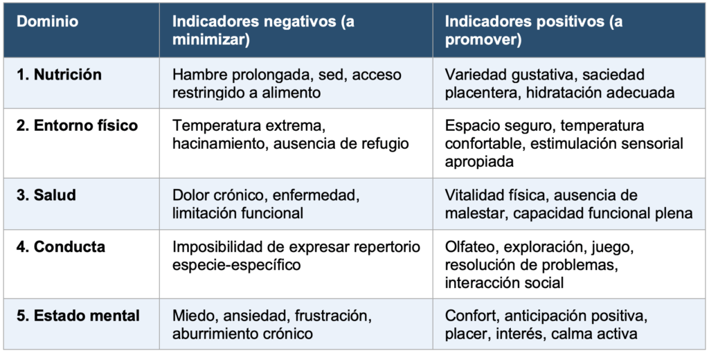 Tabla 1. Estructura del Modelo de los Cinco Dominios aplicado al perro doméstico (adaptado de Mellor et al., 2020).